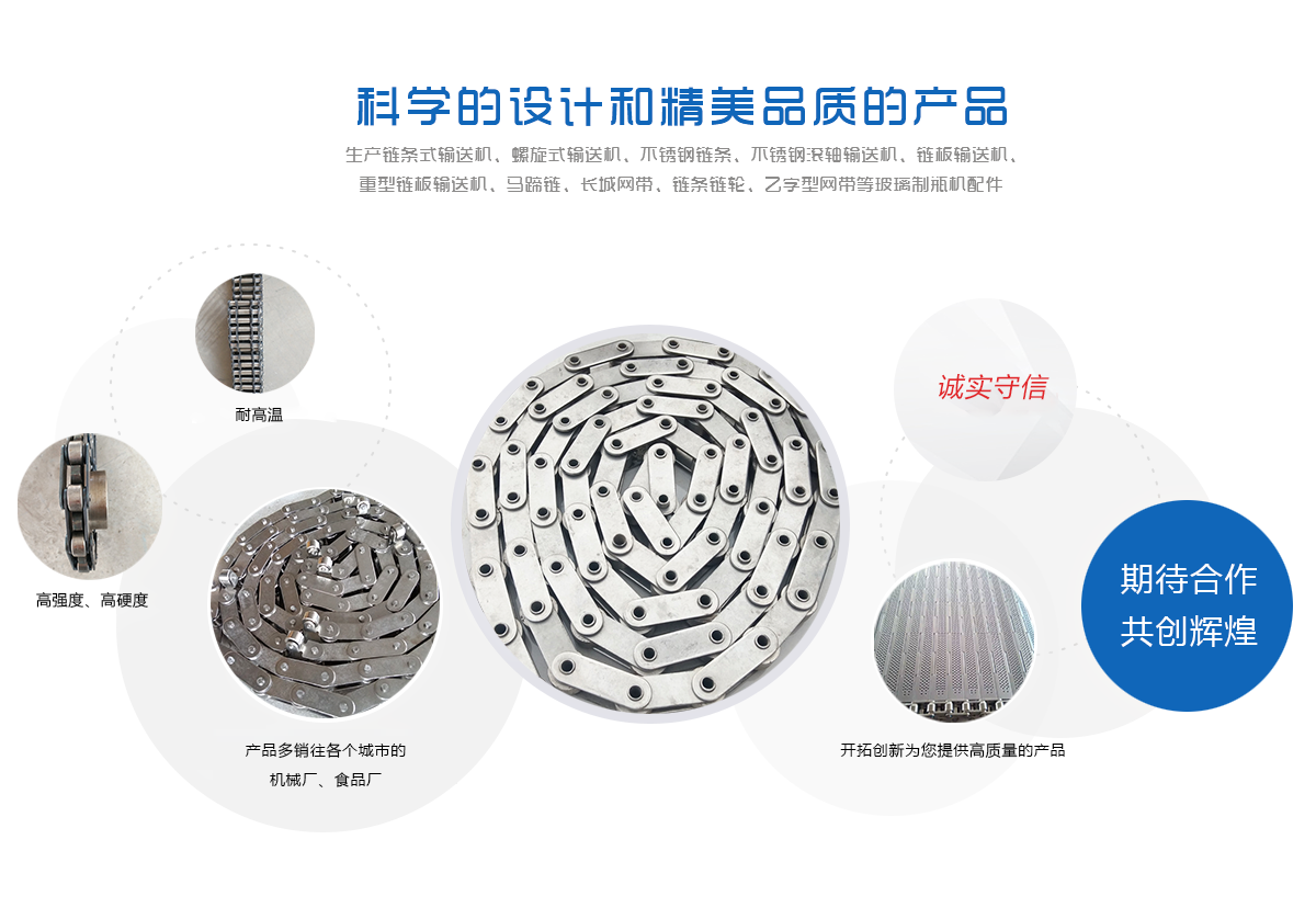 生產鏈條式輸送機、螺旋式輸送機、不銹鋼鏈條、不銹鋼滾軸輸送機、鏈板輸送機、重型鏈板輸送機、馬蹄鏈、長城網帶、鏈條鏈輪、乙字型網帶等玻璃制瓶機配件,食品機械配件及各種網帶的專業(yè)廠家 ,多年來產品暢銷各地玻璃廠和食品廠,在玻璃制品等行業(yè)中享有較高的聲譽。公司集摸具開發(fā)、機械設計生產,銷售于一體的生產型企業(yè)。生產的自動化流水線金屬傳動網帶、鏈條等產品廣泛用于玻璃機械、食品機械、化纖機械、醫(yī)藥、電子、烘干機械、輪胎機械等行業(yè)。產品多銷往各個城市的機械廠、食品廠和一些涉及流水線或自動化設備的公司。
